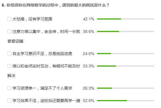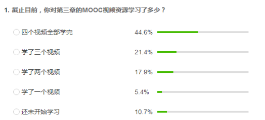 三是关注学情动态,重视学生需求。每一节课上课时,我都要落实学生的预习情况,一方面通过慕课堂的学情统计实时掌握学生的学习动态,另一方面每节课都发放调查问卷、开展讨论了解学生对课程预习的相关知识点的掌握程度,调查学习中的疑难问题,有针对性地用QQ视频电话的屏幕分享、微信群语音等手段进行重点串讲和辅导答疑,确保所有疑问都能得到及时解决,搬开自主学习路上的拦路虎,加强学生自主学习的动力,实现精准互动,强化教学效果。
