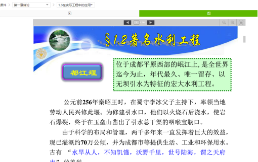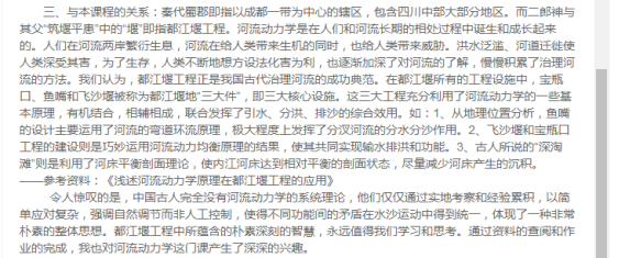第一章是绪论,我仅设计了一道灵活的简答题,发放了两张“二郎神”的图片,让大家谈谈该神话人物与我们《河流动力学概论》课程的渊源,成功引起了大家的大家的好奇心,又适时上传了关于中国古代著名水利工程的PDF课件,让大家通过驰名古今中外的一些水利工程中发现,河流动力学的知识应用如此久远和广泛,既融入社会主义核心价值观,培养学生的家国情怀,激发学生作为新时代水利人的远大理想抱负,加强对行业的认同感,又为后续课程学习做好了铺垫。大家的答案五花八门,但看得出来,大家都进行一定程度上的资料检索查阅,绝大多数同学都能找到切入点,部分同学还对资料进行了加工整理,标注了参考文献,条理分明地完成了作业,明确指出“通过资料的查阅和作业的完成,我也对河流动力学这门课产生了深深的兴趣。”