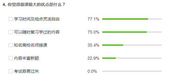 后续的问卷调查表明,大家认为MOOC 最大的有点在与学习时间灵活自由、能够随时反复学习,正适应于疫情当前的目前教学需求。但同时也对MOOC的教学质量缺乏信心,认为主要在于缺乏实体课堂的约束力,过分强调学生的学习自觉性。并且对于本课程的学习更倾向于线下实体课堂教学或者线上线下混合式教学,这都给我的教学设计带来了巨大的挑战,提出了进一步的要求,如何能发挥MOOC 之所长,却避MOOC之所短,是我亟待解决的问题。